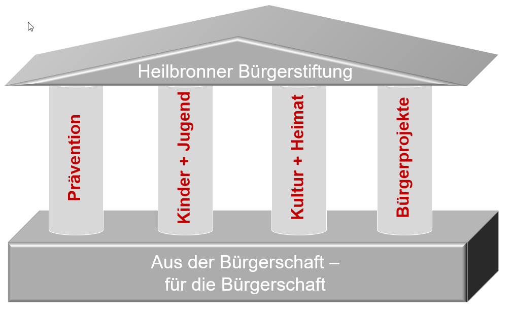 Die Heilbronner Bürgerstiftung arbeitet auf der Grundlage eines „4-Säulen-Konzeptes“, das die Fördergrundsätze entsprechend der Verpflichtung durch die Satzung beinhaltet. Wichtig ist der Heilbronner Bürgerstiftung dabei, nicht nur Projekte zu fördern oder eigene Aktivitäten durchzuführen, sondern mit einer Transparenz diese der Öffentlichkeit offen zu legen.